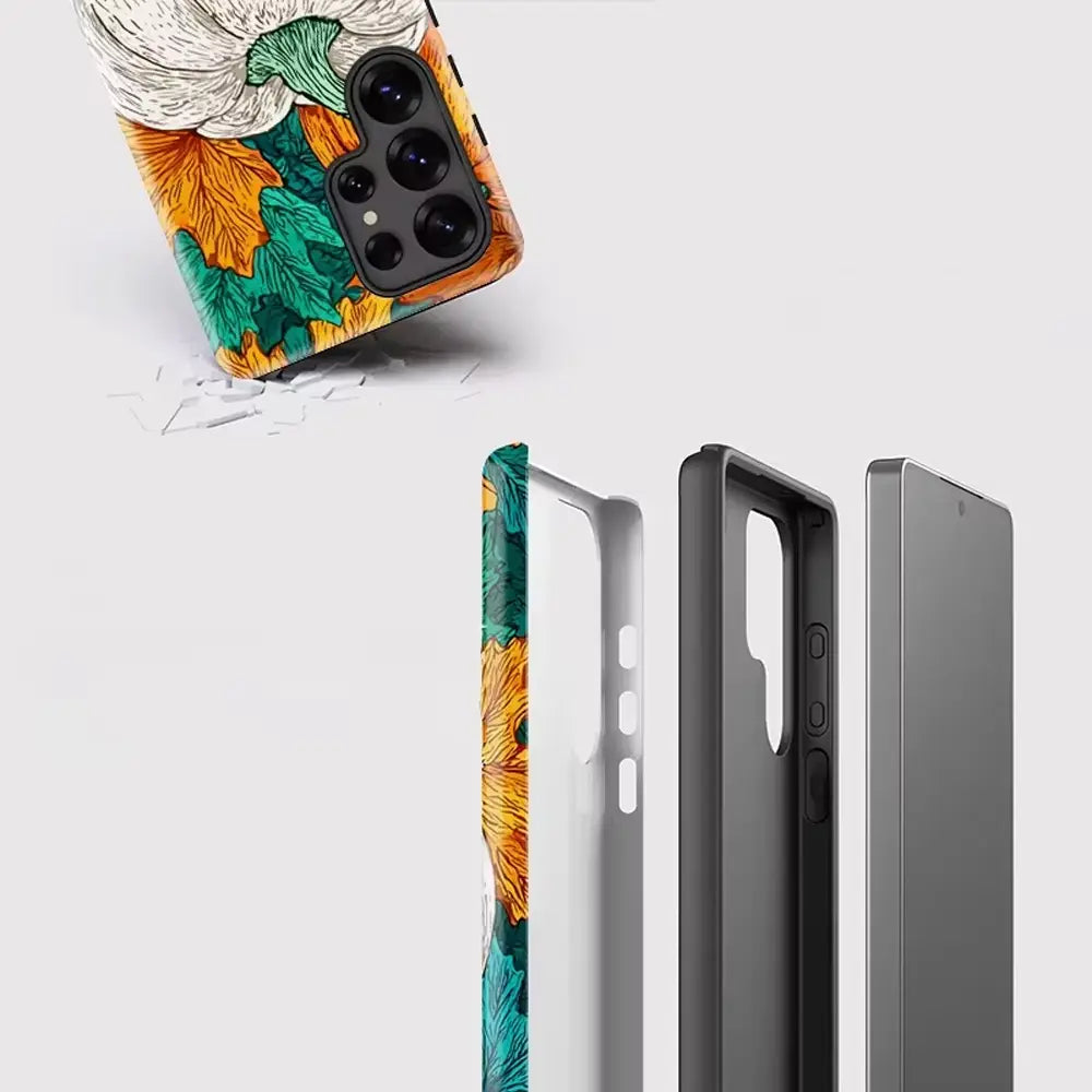 Celebrate the harvest season with this beautifully illustrated pumpkin case. The rustic, hand-drawn style showcases white and orange pumpkins nestled among autumn leaves, bringing a touch of cozy, seasonal charm to your Samsung Galaxy.
